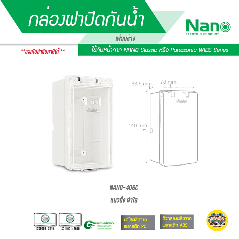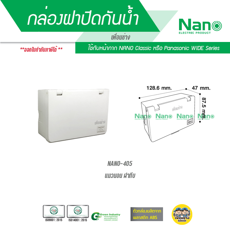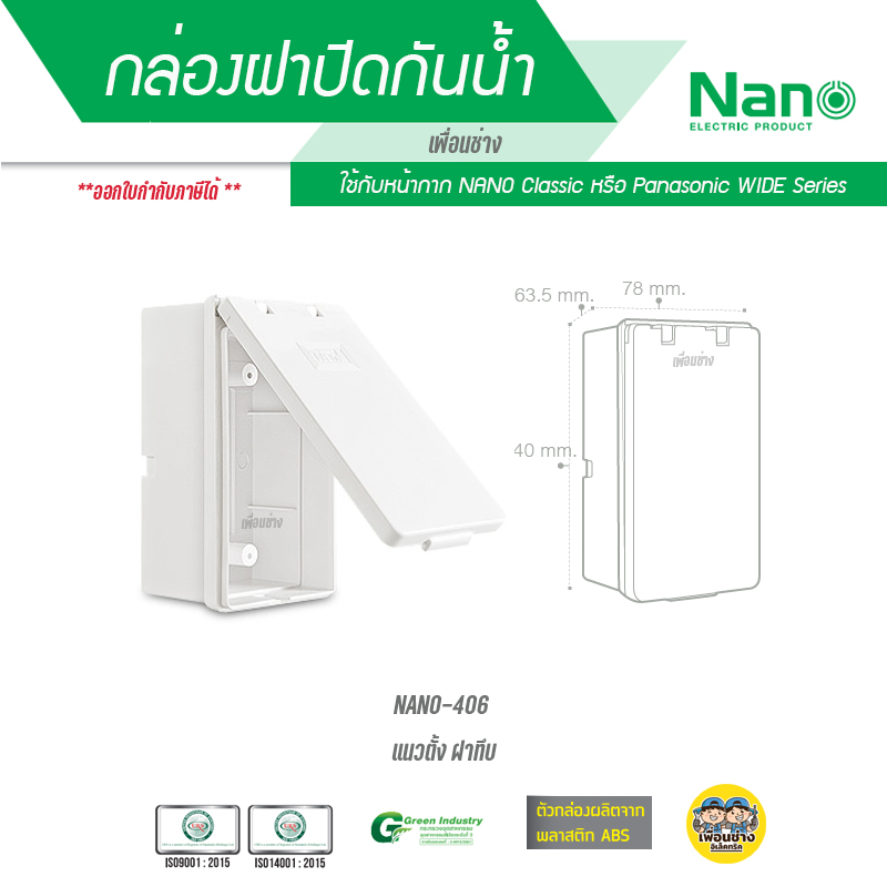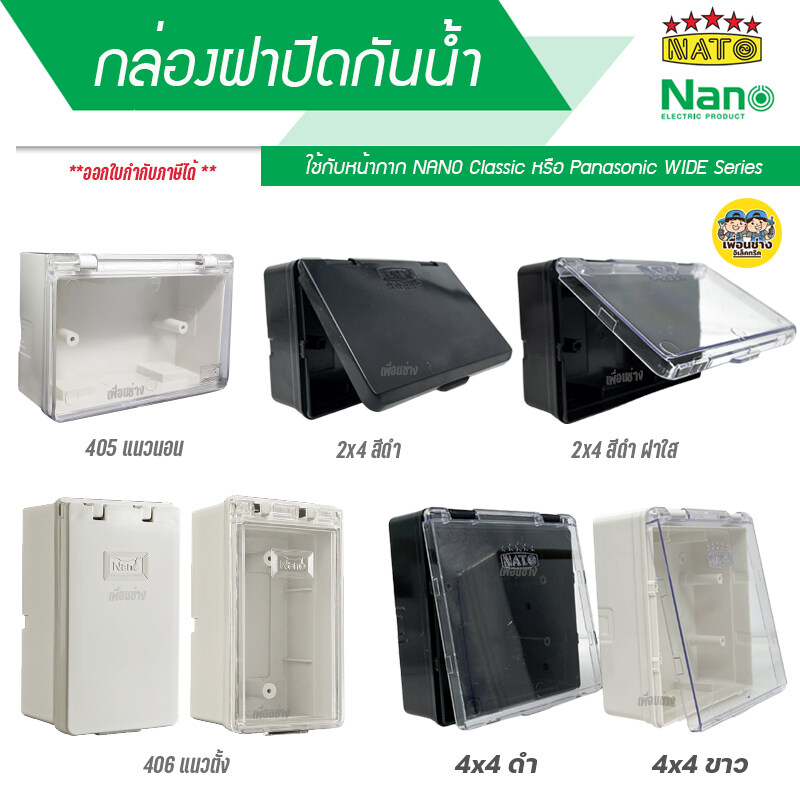 กล่องกันน้ำ มีฝาปิด ใช้ร่วมกับหน้ากากรุ่นใหม่ สีขาว/สีดำ กรุณากดเลือกแบบที่ต้องการในตัวเลือกสินค้า ส่วนกล่องกันน้ำสีขาว NATO สีขาวคนละแบบกับยี่ห้อ NANO - NANO 405 กล่องกันน้ำ แนวนอน / ฝาทึบ ขนาด 87.5 x 128.6 x 47 - NANO 405C กล่องกันน้ำ แนวนอน / ฝาใส ขนาด 87.5 x 128.6 x 47 - NANO 406 กล่องกันน้ำ แนวตั้ง / ฝาทึบ ขนาด 70.5 x 119.5 x 46 - NANO 406C กล่องกันน้ำ แนวตั้ง / ฝาใส ขนาด 70.5 x 119.5 x46
